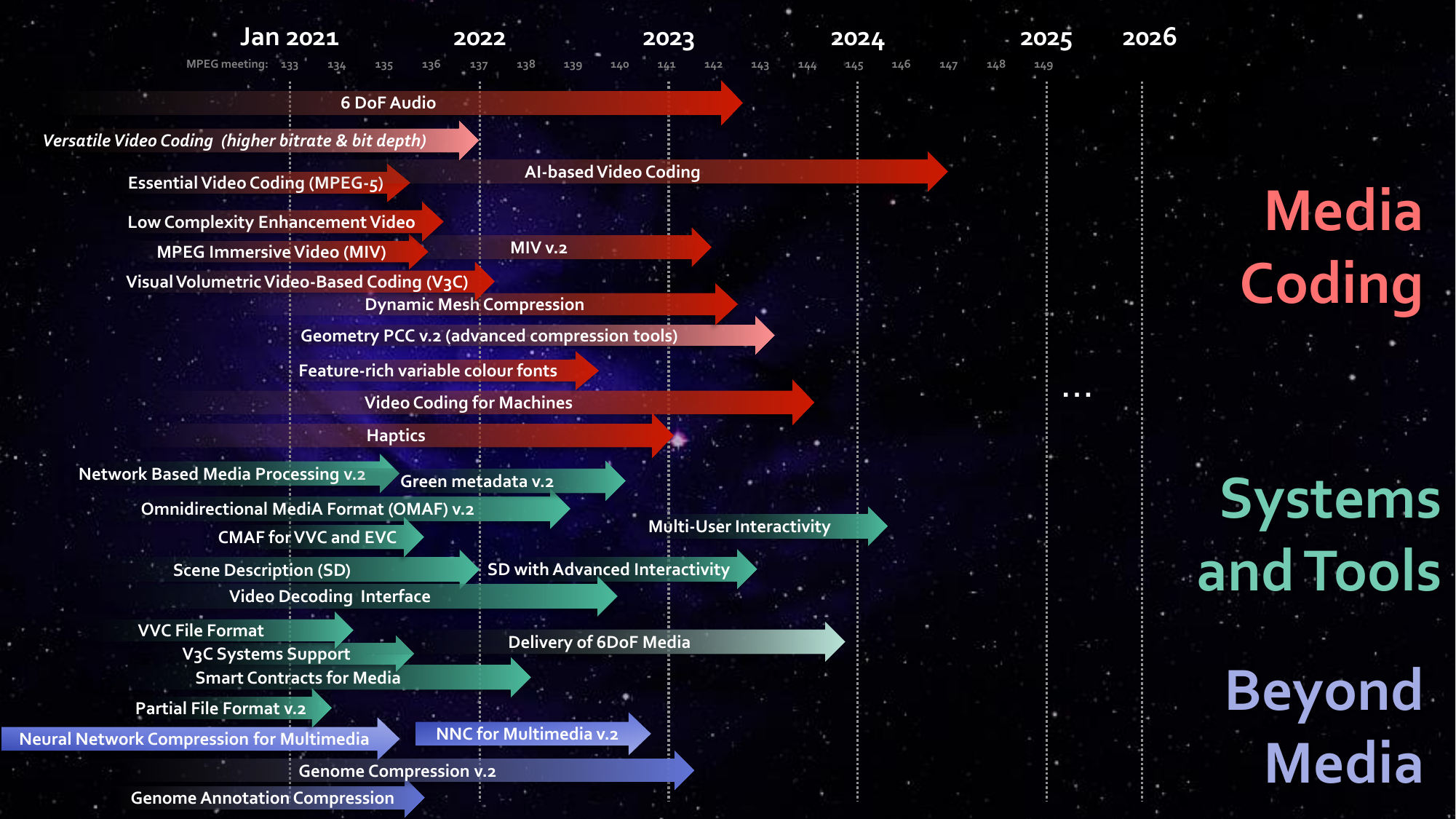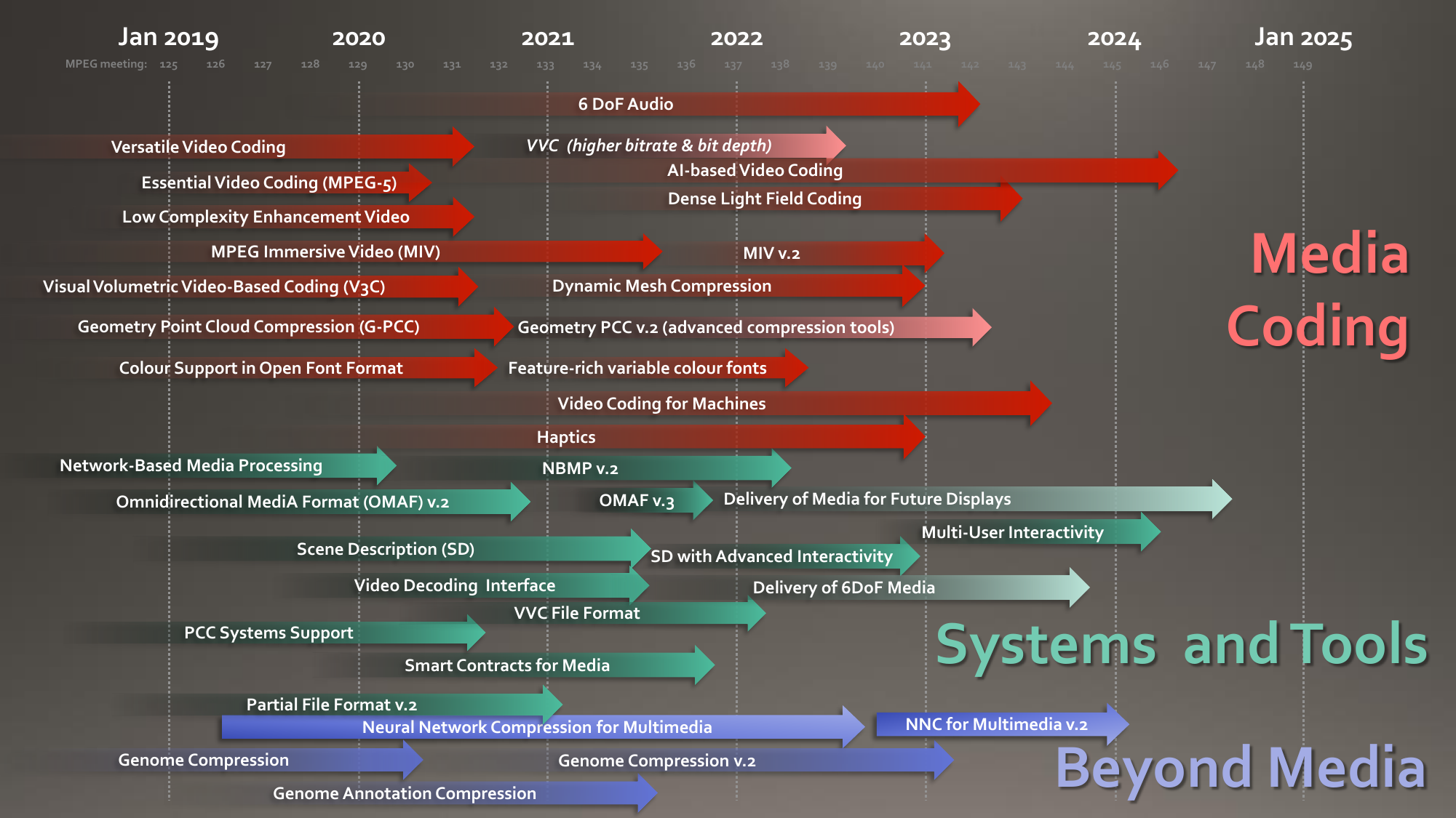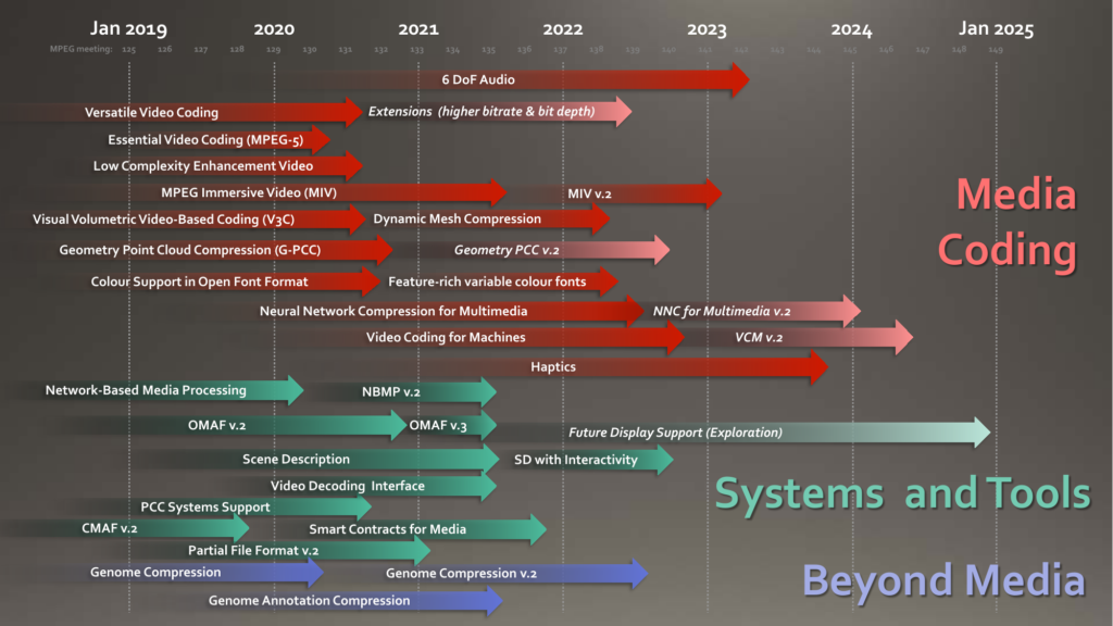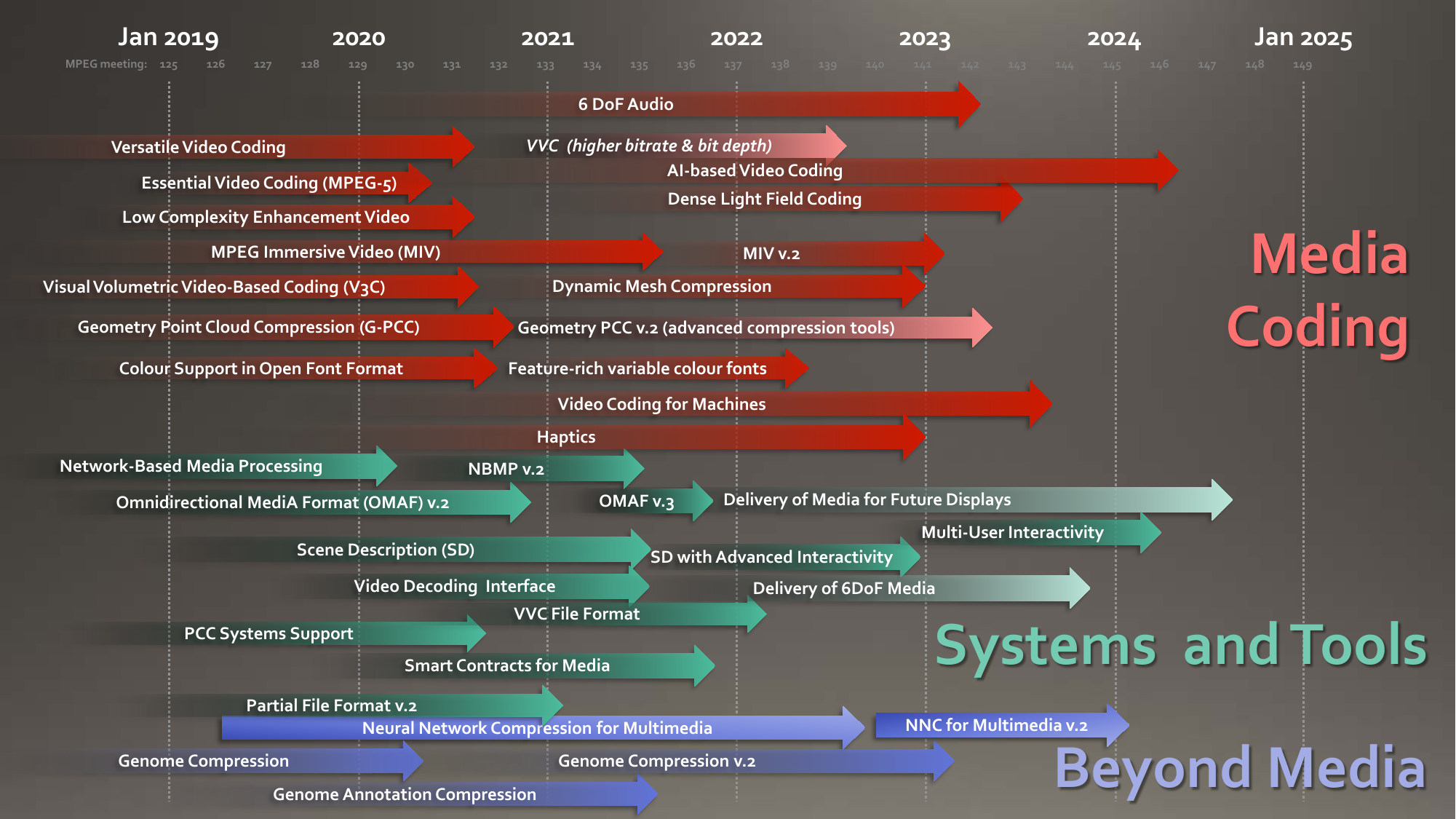 MPEG developed well known video and audio coding standards such as AVC, HEVC, VVC and MP3. For a broader overview of MPEG standards see here. Also in future MPEG is going to develop innovative standards as illustrated in the roadmap:
